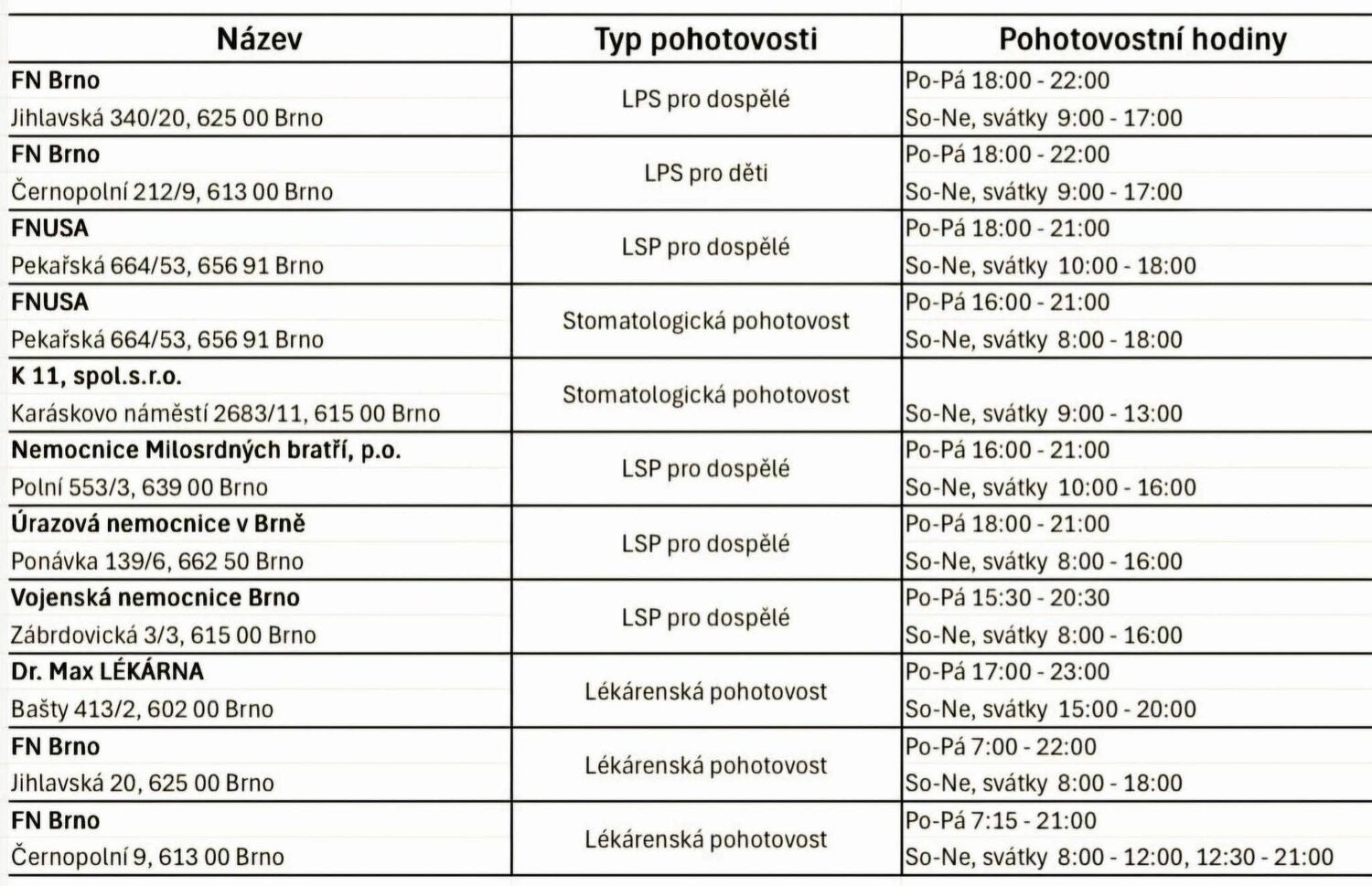 - Gynekologická pohotovost: FN Brno (Bohunice) nebo Nemocnice Milosrdných bratří.